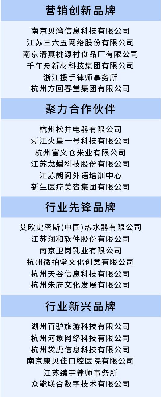 在百度品牌之夜活動(dòng)上,根據(jù)數(shù)據(jù)趨勢(shì)、百度搜索熱度排名、行業(yè)影響,分別發(fā)布了營銷創(chuàng)新品牌、聚力合作伙伴、行業(yè)先鋒品牌、行業(yè)新興品牌等獎(jiǎng)項(xiàng),24家江浙品牌企業(yè)榮獲獎(jiǎng)項(xiàng),以鼓勵(lì)江浙品牌企業(yè)長遠(yuǎn)發(fā)展。