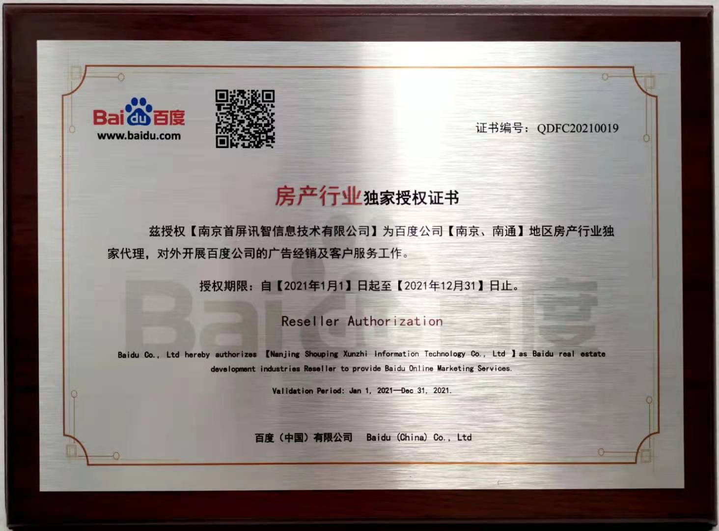 會上,百度公司正式授權(quán)南京首屏訊智信息技術(shù)有限公司為南京、南通地區(qū)房產(chǎn)行業(yè)獨(dú)家代理商及百度房產(chǎn)平臺南京、南通地區(qū)獨(dú)家運(yùn)營商,并頒發(fā)授權(quán)證書。首屏訊智自2004年成為百度合作伙伴,始終致力于為廣大企業(yè)提供優(yōu)質(zhì)的互聯(lián)網(wǎng)營銷服務(wù)。擁有17年豐富互聯(lián)網(wǎng)行業(yè)服務(wù)經(jīng)驗(yàn)的首屏訊智,已服務(wù)南京企業(yè)2萬余家,助力廣大企業(yè)快速穩(wěn)健發(fā)展。